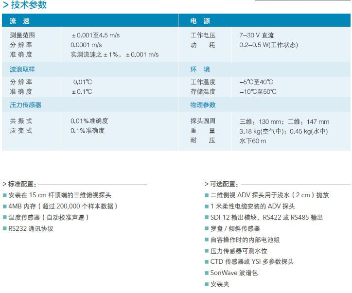 · 領先的低速(sù)(可測最低流速(sù)達0.001 m/s)、淺水(最淺可(kě)達0.02 m)性能