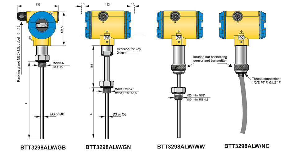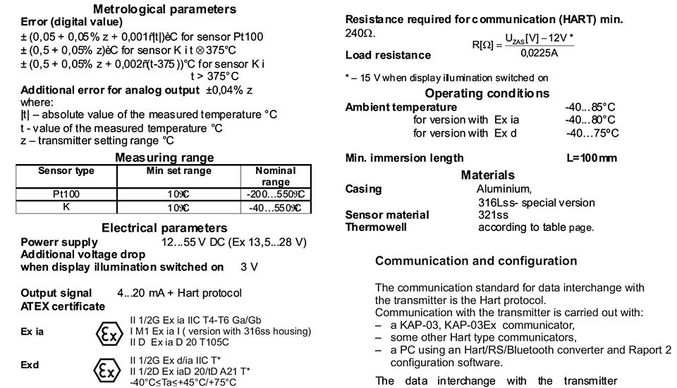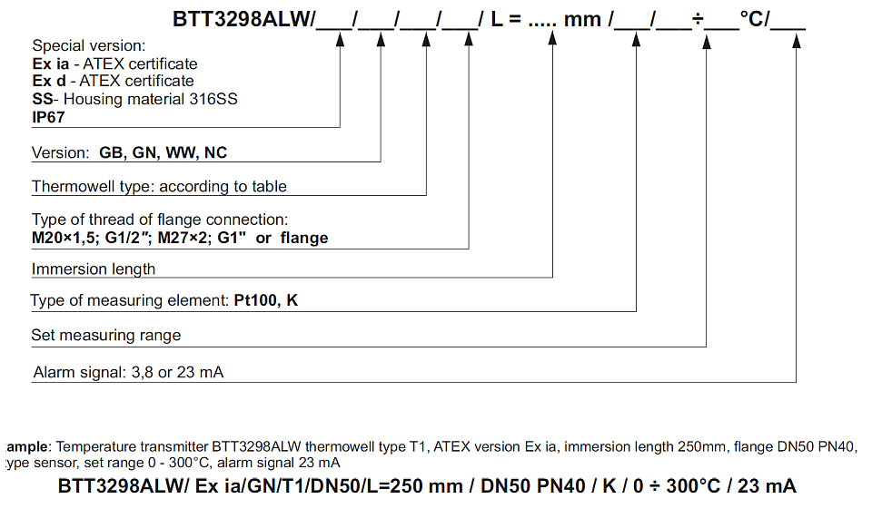 BTT3298溫度變(bian)送器适用(yòng)于将熱電(diàn)偶傳感器(qi)的溫度或(huò)電壓電阻(zu)轉換💰為标(biāo)準電流信(xin)号4-20mA。變送器(qì)有兩個獨(dú)立的通♈道(dao),可以測量(liang)溫差、平均(jun)值、帶冗餘(yu)的平均值(zhí)、最大值或(huo)最低溫度(dù)。變送器使(shi)用内部/外(wai)部(Pt100)傳感器(qì)或恒溫補(bu)償🏃🏻環境溫(wēn)度影響和(he)熱電偶冷(lěng)端補償。大(dà)多數參數(shù),例如:傳感(gan)器類型、測(cè)量範圍、電(diàn)路斷路時(shí)的電流報(bào)警信🈲号、輸(shū)出特性校(xiào)正、用戶特(tè)性(60 點)使用(yong)帶💘有 Hart/USB/藍牙(ya)轉換器和(he) BASI RAPORT 2 配置軟件(jian)或 KAP 的 PC 進行(háng)編程- 03 通訊(xùn)器。根據要(yào)求,BASI 可以設(shè)置溫度變(bian)送器參數(shu),如測量範(fan)圍、傳感器(qi)類型。變送(song)器 BTT3298 專為現(xian)場使用而(ér)設計。BTT3298 可🏃🏻♂️與(yu)直接安裝(zhuāng)在變送器(qi)外殼中🌈的(de)溫度傳感(gan)器或通過(guò)電纜連接(jie)的外部傳(chuán)感器一起(qi)使用。它們(men)的值印在(zài)标♋簽上。