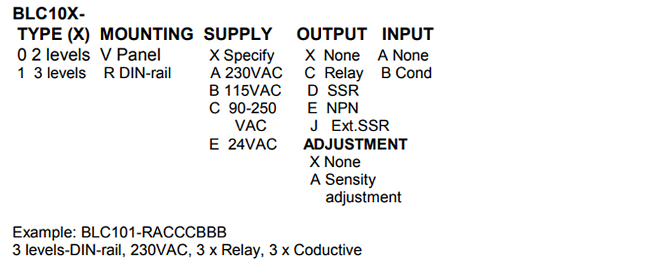 産品介紹BLC10X 控(kòng)制器是低成本(ben)的電子液位控(kong)制器/指示器,可(kě)用✂️于 DIN 導軌和面(miàn)闆安裝。他們采(cai)用測量電極之(zhī)間或電極與金(jīn)屬容器外殼💜之(zhī)間的液體電導(dao)率。BLC10X适用于化學(xué)、造紙🐅、食品、酒類(lèi)、生物技術等行(háng)業常用的電導(dǎo)率較高的液體(tǐ)。液位計BLC10X可監測(cè)1或2個固定液位(wèi),BLC10X可監測1、2或3個固(gù)定液位.當達到(dào)每個級别時,相(xiang)應的繼電器被(bei)激活或停用(排(pai)水/供應控制♊)。BLC101 也(ye)可用作帶有🔅報(bào)警繼電器的排(pai)水或供水液位(wèi)控制器(參見型(xíng)号 BLC105)。BLC10X液位指示器(qi)/控制器基于高(gāo)科技微處理器(qì)電路,保證精度(dù)和穩定性,防止(zhi)電解極化,确保(bǎo)穩定運行。級⭐别(bié)到達的繼電器(qì)動作方向以及(jí)級别之間的🥰連(lian)接(依賴性)是可(kě)編程🥰的。輸出繼(jì)電❄️器⁉️可用于發(fā)出已達到液🆚位(wei)的信号或控制(zhì)電動執行器。調(diào)整輸出激活阈(yu)值以及 LED 指示的(de)可能性使 BLC10X 電平(ping)指示器成為解(jie)決各種電平相(xiang)關問題的解決(jue)方案。性能特點(dian)多達 3 個液位和(hé) 3 個繼電器輸出(chu)(獨立)2 個相關液(yè)位的變體加上(shàng)警報從電導池(chi)電極輸入排水(shui)和供應控制輸(shū)出激活阈值調(diao)整達到水平的(de)指示低成本