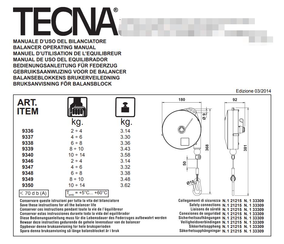 TECNA 平衡器 9350 特(tè)點:堅固的結構(gòu),鑄鋁機身。不鏽(xiù)鋼電纜。容量可(kě)調。輔助安全懸(xuán)架。防止彈簧斷(duàn)裂(>3kg)引起的負載(zǎi)下降的安全裝(zhuang)置。可調行程限(xian)制裝置。采用減(jian)摩材料的電纜(lǎn)導軌。惰性彈簧(huáng)鼓組件。聚酰胺(an)頂針。